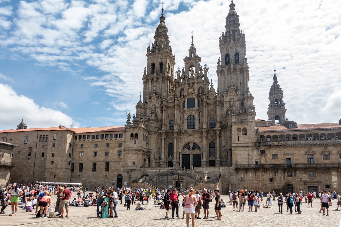 Jokue-photography / Shutterstock.com Pilgrims and tourists explore the bustling square in front of the magnificent Cathedral of Santiago de Compostela under a partly cloudy sky.